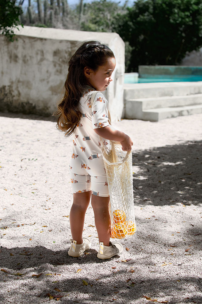 Kombinezon dziecięcy Lassig to praktyczne i wygodne rozwiązanie na słoneczne dni nad wodą. Wykonany z lekkiego, szybkoschnącego materiału, zapewnia skuteczną ochronę przed promieniowaniem UV, dzięki czemu delikatna skóra dziecka jest bezpieczna podczas zabawy na plaży czy basenie. Model utrzymany jest w jasnym, kremowym kolorze i ozdobiony uroczym wzorem z pieskami w różnych pozach, co nadaje mu radosny, dziecięcy charakter. Krótki rękaw oraz nogawki gwarantują swobodę ruchów i komfort nawet w upalne dni. Z przodu znajduje się praktyczny zamek błyskawiczny, który ułatwia szybkie zakładanie i zdejmowanie kombinezonu, a dodatkowa osłona przy szyi zwiększa wygodę noszenia i chroni skórę przed podrażnieniami. Elastyczny materiał dobrze dopasowuje się do ciała dziecka, nie krępując ruchów podczas zabawy w wodzie i na lądzie. Kombinezon Lassig to idealny wybór dla rodziców, którzy szukają funkcjonalnej odzieży łączącej ochronę UV, komfort użytkowania oraz atrakcyjny design.