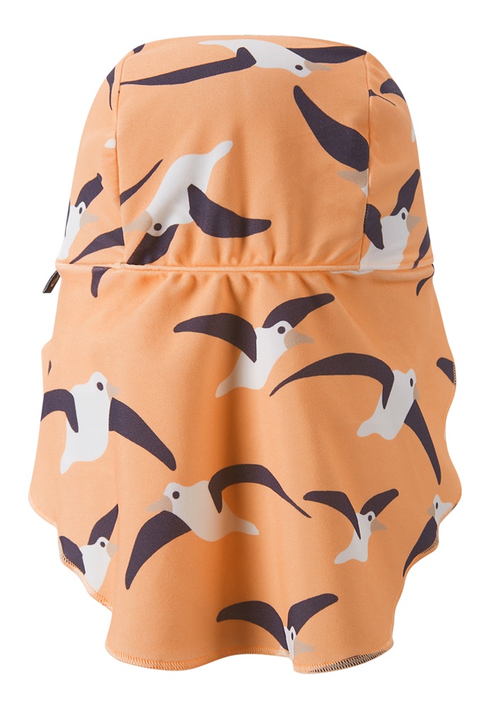 Pomarańczowa czapka UV z daszkiem i osłoną na kark i uszy to niezbędny element garderoby każdego dzieciaczka. Czapka z filtrem UV marki Reima posiada filtr UPF 50+ blokujący 98% szkodliwego promieniowania słonecznego, dlatego będzie to idealny wybór, jeżeli chcesz chronić swojego malucha przed słońcem. Został wykonany z lekkiego, oddychającego i szybkoschnącego materiału, w związku z czym nadaje się zarówno do wody, jak i do codziennej zabawy na słońcu oraz spacerów.